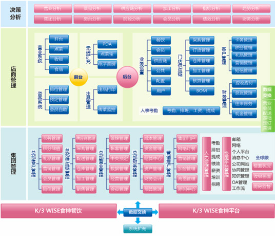金蝶 K/3 WISE酒楼连锁行业管理解决方案针对当前餐饮酒楼连锁企业运营的需求,通过建设分店的信息管理系统解决店面的运营问题,通过集团会员管理模块、集团中央配送模块、集团营业管理模块解决企业的会员、配送和门店营业的远程集中管控,通过数据交换平台实现分店和总部之间的数据交换,为企业提供有效、准确、及时的业务分析数据,从而保证企业做出准确的经营决策