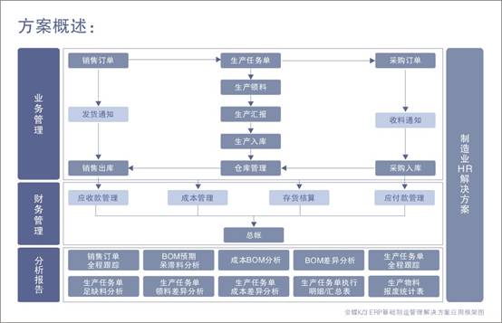 - 本方案的核心设计思想是:以销售业务为源头,通过业务订单这个“火车头”拉动整个企业的生产、采购、仓储一直到出运整个流程,实现销售、生产、采购三大业务以订单为核心的可视化全程跟踪;并辅以产品成本、订单成本等计算与分析工具,以科学规范的生产数据管理,帮助企业建立以销售订单驱动生产和采购业务的生产管理模式。